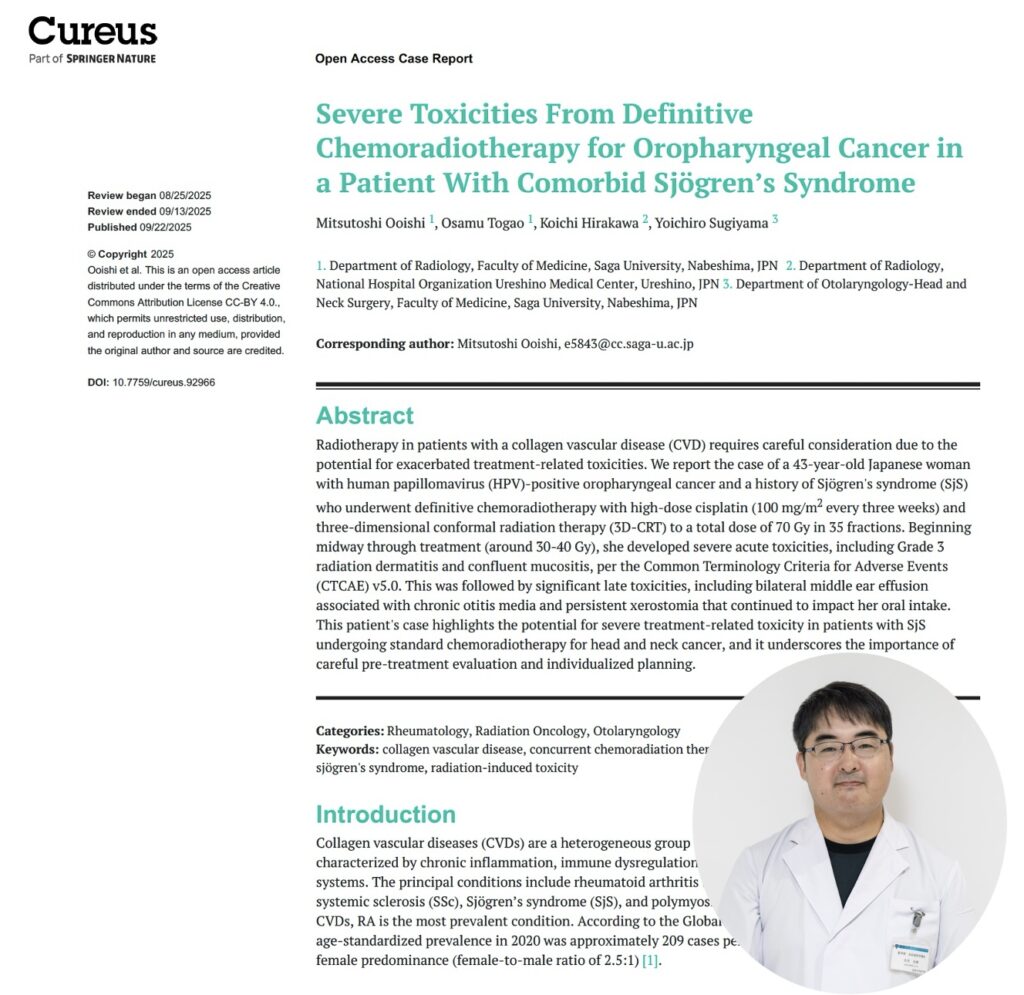 本論文では、シェーグレン症候群を合併した中咽頭癌症例に対する化学放射線療法(シスプラチン併用70Gy照射)の過程で、重度の急性・晩期有害事象(粘膜炎、皮膚炎、中耳炎、持続する口腔乾燥など)が出現した経過を報告しました。